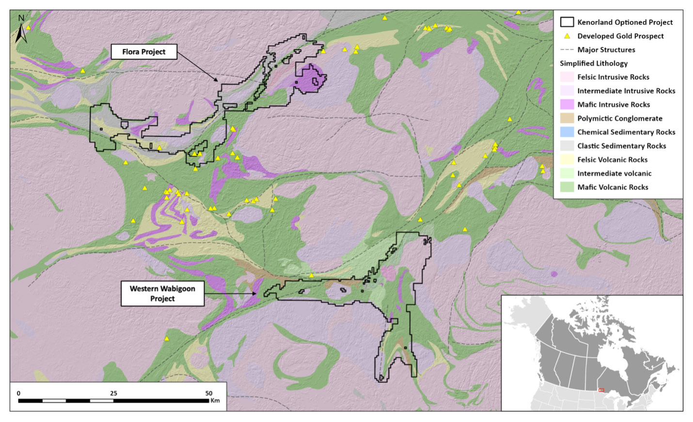 Figure 1. Regional geology of the Western Wabigoon subprovince with Western Wabigoon and Flora Project locations