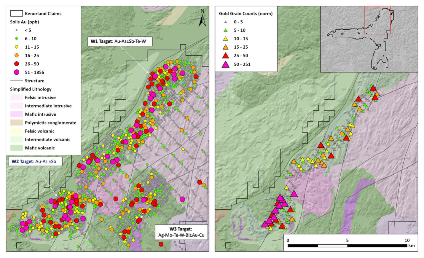 Large-scale systematic geochemical surveys have defined a ~19 kilometre gold-in-till trend along a major structural corridor. Within this corridor, infill sampling completed in 2025 further refined multiple coherent, high-tenor gold-in-till anomalies across the W1, W2 and W3 target areas. Gold grain analysis from heavy mineral concentrate (HMC) till sampling has reinforced this interpretation, with the W2 target producing a strong, continuous gold-grain anomaly, including normalised counts of up to 251 grains per sample, along a 4km trend open to the southwest. Together, these results highlight W2 as a priority for follow-up exploration in 2026 including diamond drilling. The W2 Target area encompasses an area of numerous multi-gram per tonne Au showings from trenching and shallow drilling within an area historically known as the Sorry Mac trend. Surface work conducted by Kenorland has confirmed gold mineralisation along the trend with rock samples up to 7.75 g/t Au, and significantly expanded the historical footprint into what is now referred to as the W2 Target.