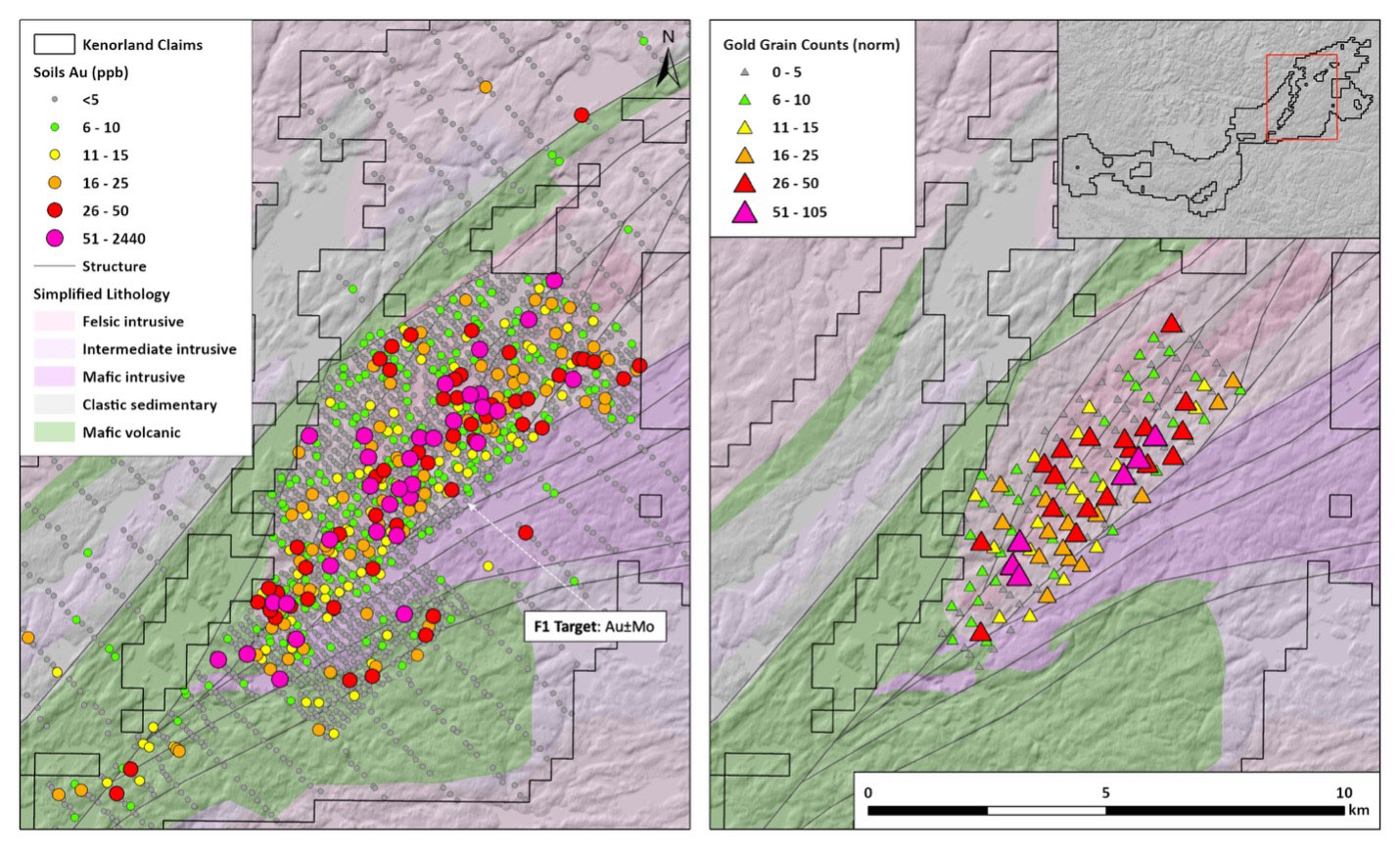 The Company completed extensive follow-up work during the 2025 exploration program, including infill soil samples on a 100 m x 200 m grid across both the F1 and F2 target areas, along with mapping and prospecting. In addition, HMC till samples were collected at 250 m x 500 m spacing for gold grain analysis, and a heliborne magnetic, VLF-EM, and radiometric survey was flown over the F1 target to refine structural and lithological interpretation and support ongoing target development.