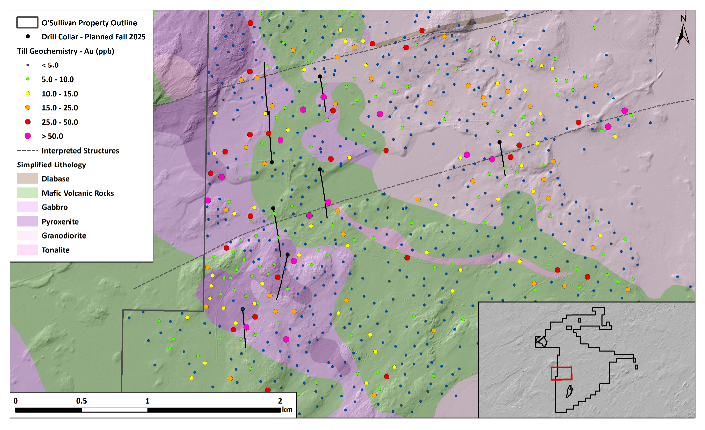 Figure 1. Plan map of planned drill hole locations with geology and gold-in-till geochemistry
