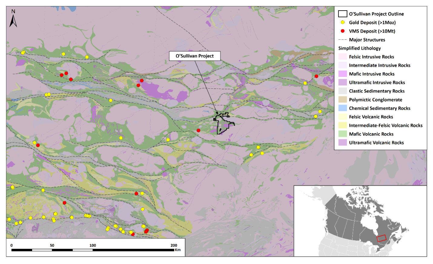 Figure 2. Regional geology with significant gold and VMS deposits and O’Sullivan Project location