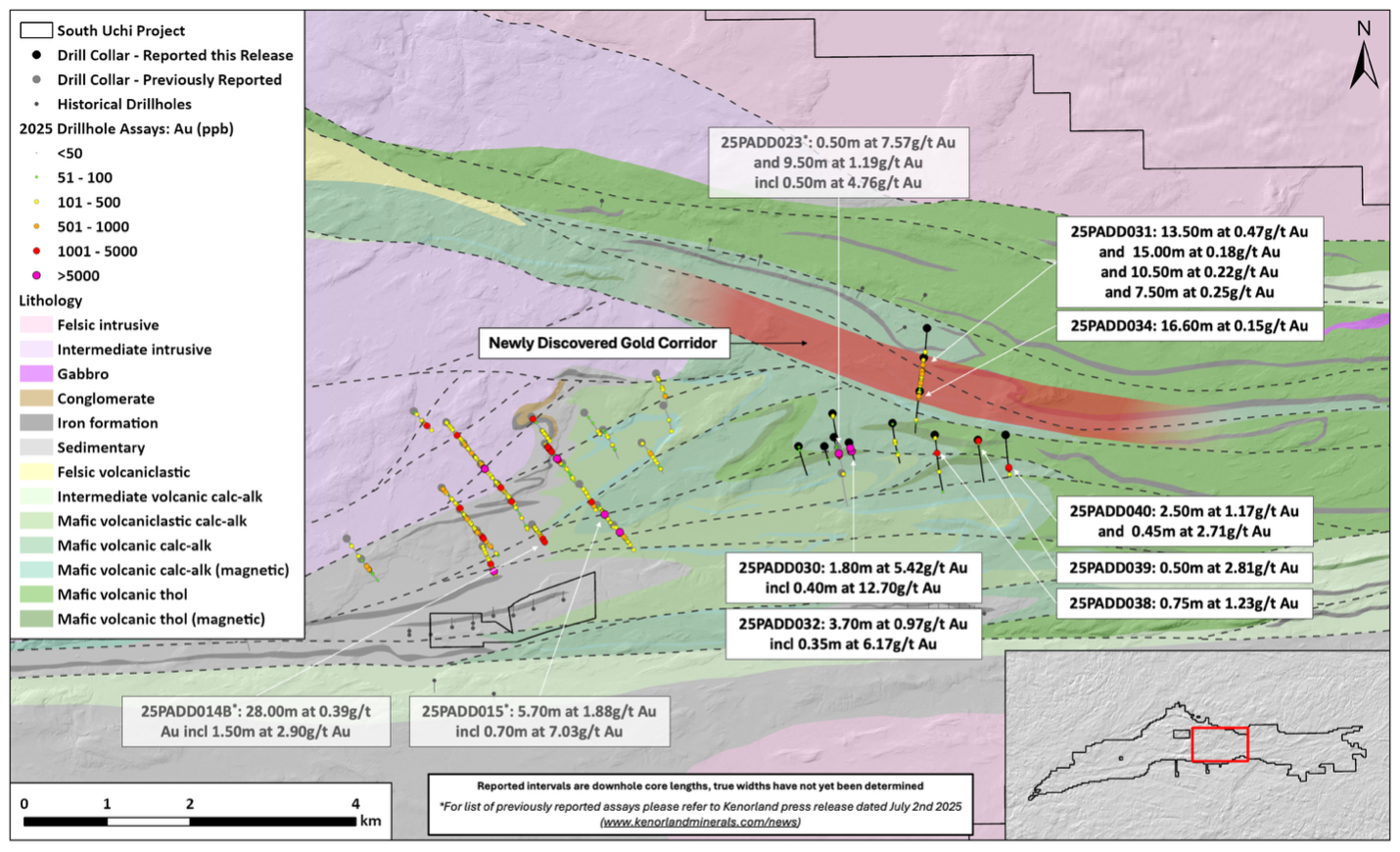 Zach Flood, President and CEO of Kenorland Minerals, commented, “The drill results continue to validate the systematic approach we’ve taken at South Uchi. The identification of a previously untested, gold-bearing structural corridor beneath cover is particularly encouraging and reinforces that Papaonga sits within a much larger mineralised system. With up to eight kilometres of strike now emerging as a priority target, we believe South Uchi offers meaningful discovery upside as we advance into the next phase of drilling.”