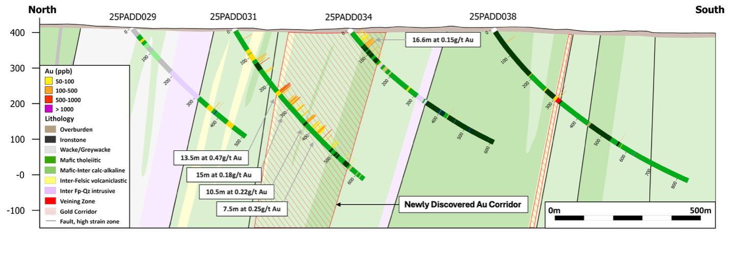 Step-out drilling along the southern structural trend targeted extensions east, west, and down-dip from 25PADD023. Multiple holes intersected quartz-sulphide veining with carbonate-chlorite-silica alteration hosted within mafic volcanic rocks, locally containing visible gold. Notably, hole 25PADD030 returned 1.80 m at 5.42 g/t Au, including 0.40 m at 12.70 g/t Au, confirming continuity of high-grade mineralisation along the structure.