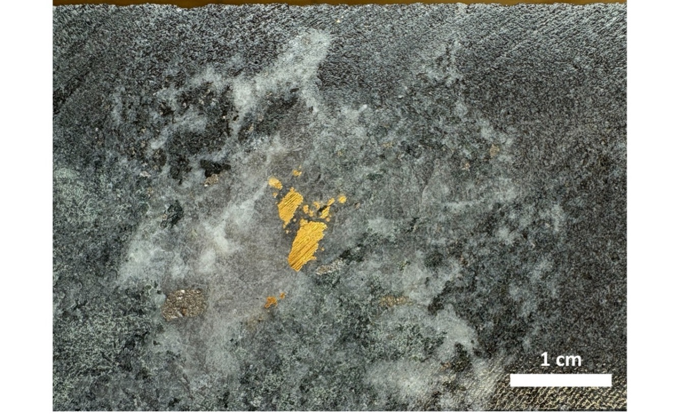 Figure 2. 166.14 g/t Au quartz-amphibole-arsenopyrite-gold vein from 25OPDD007, 459.85-460.15m