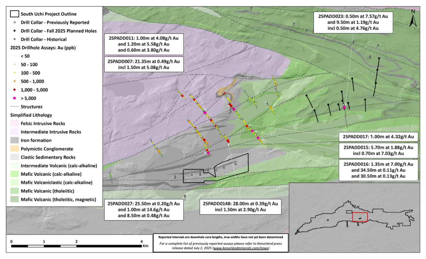 Zach Flood, President and CEO of Kenorland, stated, “We’re excited to return to South Uchi following a very successful maiden drill program earlier this year. The initial campaign confirmed widespread gold mineralisation in bedrock across multiple kilometres of strike. Among the most compelling results was along the eastern extent of the target area, where drilling intersected a strongly mineralised and altered shear zone hosting multiple generations of veining, sulphidation, and visible gold—hallmarks of a robust orogenic gold system. The current drill program will step out from this discovery as well as test additional targets concealed beneath thick overburden.”