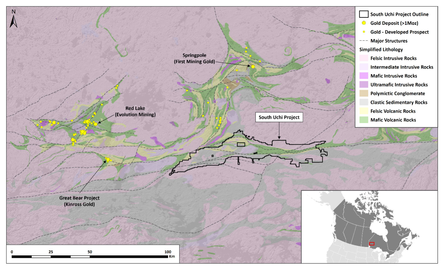 Figure 2. Regional volcanic assemblages with significant gold deposits and South Uchi Project location