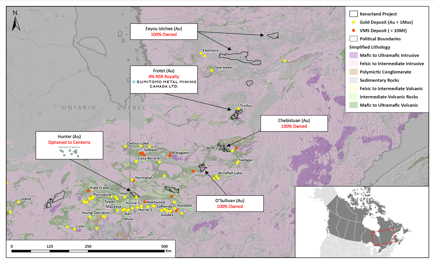 Kenorland Minerals Ltd. (TSXV: KLD) is a well-financed mineral exploration company focused on project generation and early-stage exploration in North America. Kenorland’s exploration strategy is to advance greenfields projects through systematic, property-wide, phased exploration surveys financed primarily through exploration partnerships including option to joint venture agreements. Kenorland holds a 4% net smelter return royalty on the Frotet Project in Quebec, which is owned by Sumitomo Metal Mining Canada Ltd. The Frotet Project hosts the Regnault gold system, a greenfields discovery made by Kenorland and Sumitomo Metal Mining Canada Ltd. in 2020, which contains an Inferred Mineral Resource of 14.5 Mt at 5.47 g/t Au for 2.55 Moz of gold. Kenorland is based in Vancouver, British Columbia, Canada.