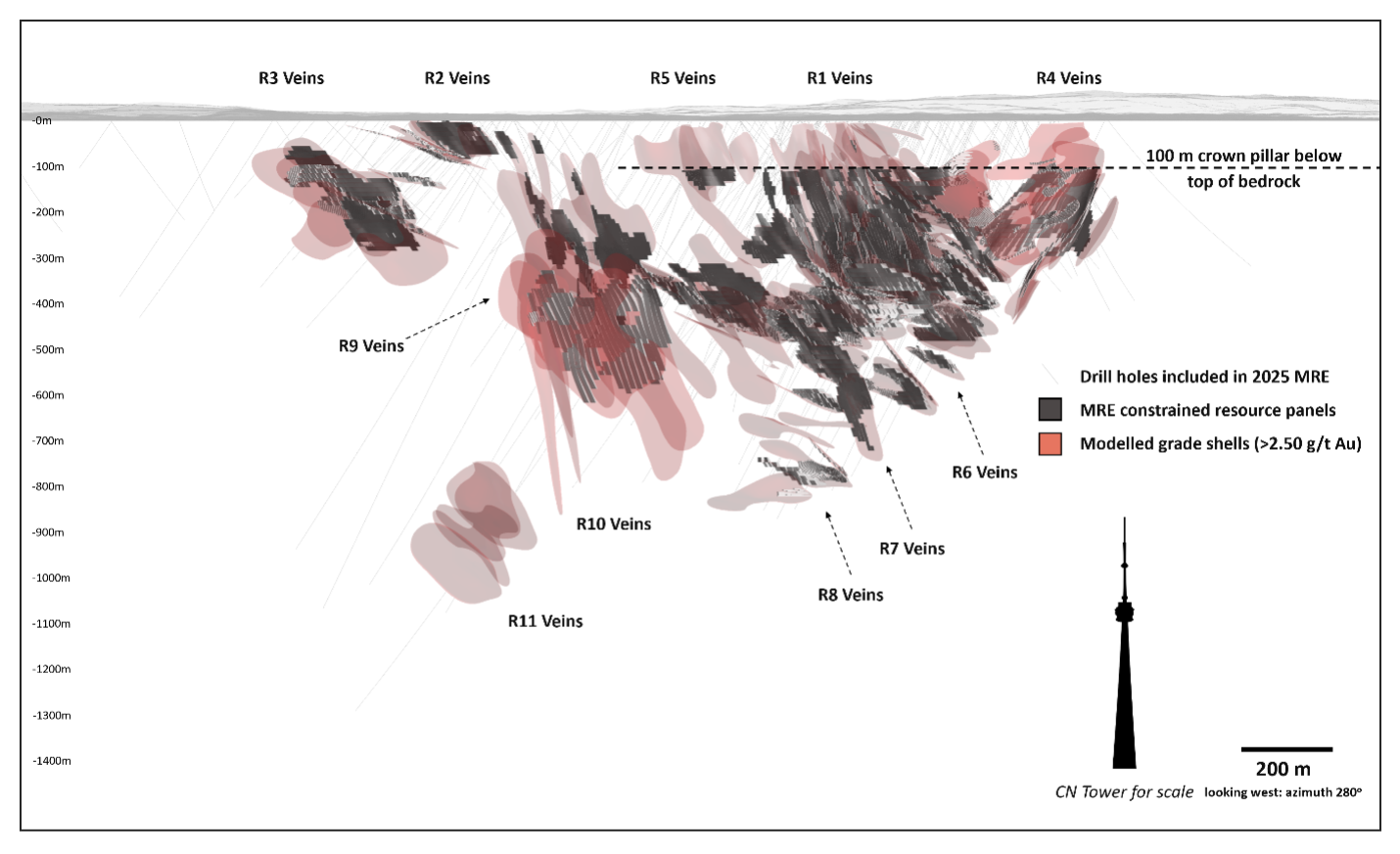 The maiden Mineral Resource Estimate (“MRE”) incorporates all drilling completed to the end of the 2025 winter program, comprising 289 diamond drill holes totalling 127,217 metres. Modelled grade shells, each supported by a minimum of three drill holes at up to approximately 100 m spacing, include 92 high-grade veins defined using a 2.50 g/t Au cut-off, as well as a broader low-grade envelope encompassing 91 veins at a 0.30 g/t Au cut-off.