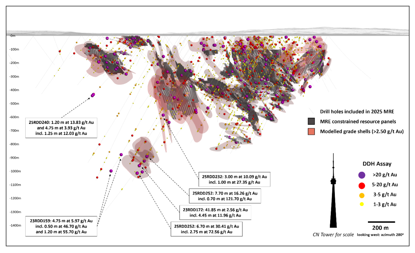 - Within the modelled R11 trend: 6.70m at 30.41 g/t Au, including 2.75m at 72.56 g/t Au (25RDD252); 7.70m at 16.26 g/t Au, including 0.70m at 121.70 g/t Au (25RDD252); and 4.45m at 11.96 g/t Au (23RDD172)1,2