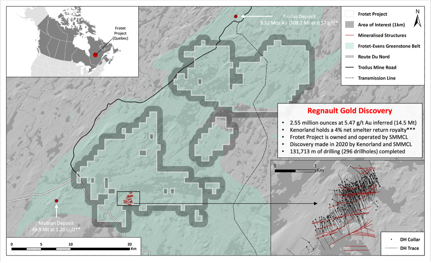 The Frotet Project was acquired by Kenorland through map staking in March, 2017 and was optioned to Sumitomo Mining Metals Canada Limited (“SMMCL”) in April, 2018. In summer of 2018, Kenorland and SMMCL completed a property-wide B-horizon soil sampling program (till substrate) over 55,921 ha on an approximate 1500m x 150m grid for a total of 2,308 samples. In winter of 2018-2019 a high-resolution helicopter-borne aeromagnetic survey was flown over areas of gold-in-soil anomalism. In spring of 2019, a property-wide LIDAR survey was flown to give context to surficial geology conditions and structural geology. In summer of 2019, infill soil sampling, till sampling, geologic mapping and boulder prospecting were conducted in geochemically anomalous areas. This work defined the Regnault target area, which was selected for a maiden diamond drilling program in winter of 2020. In preparation for diamond drilling Kenorland conducted further geophysical work including a high-resolution drone magnetic survey and an induced polarisation (IP) survey to aide in the delineation of targets.