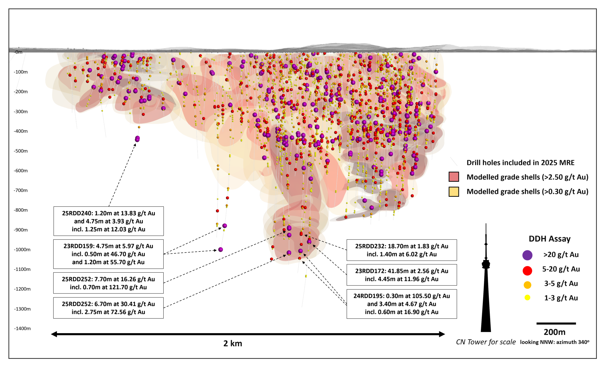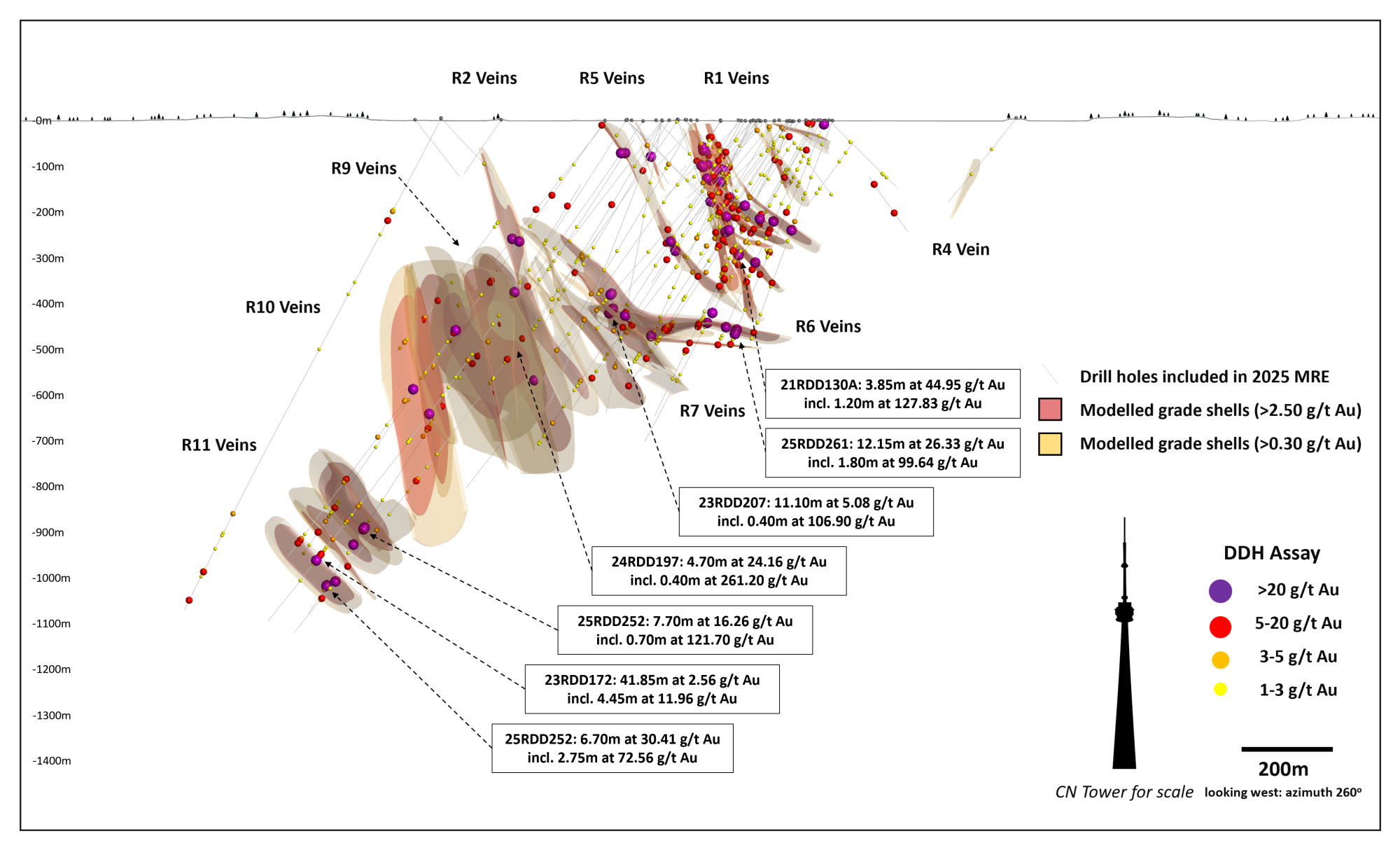 - 25RDD261: 12.15m at 26.33 g/t Au incl. 1.80m at 99.64 g/t Au at R6