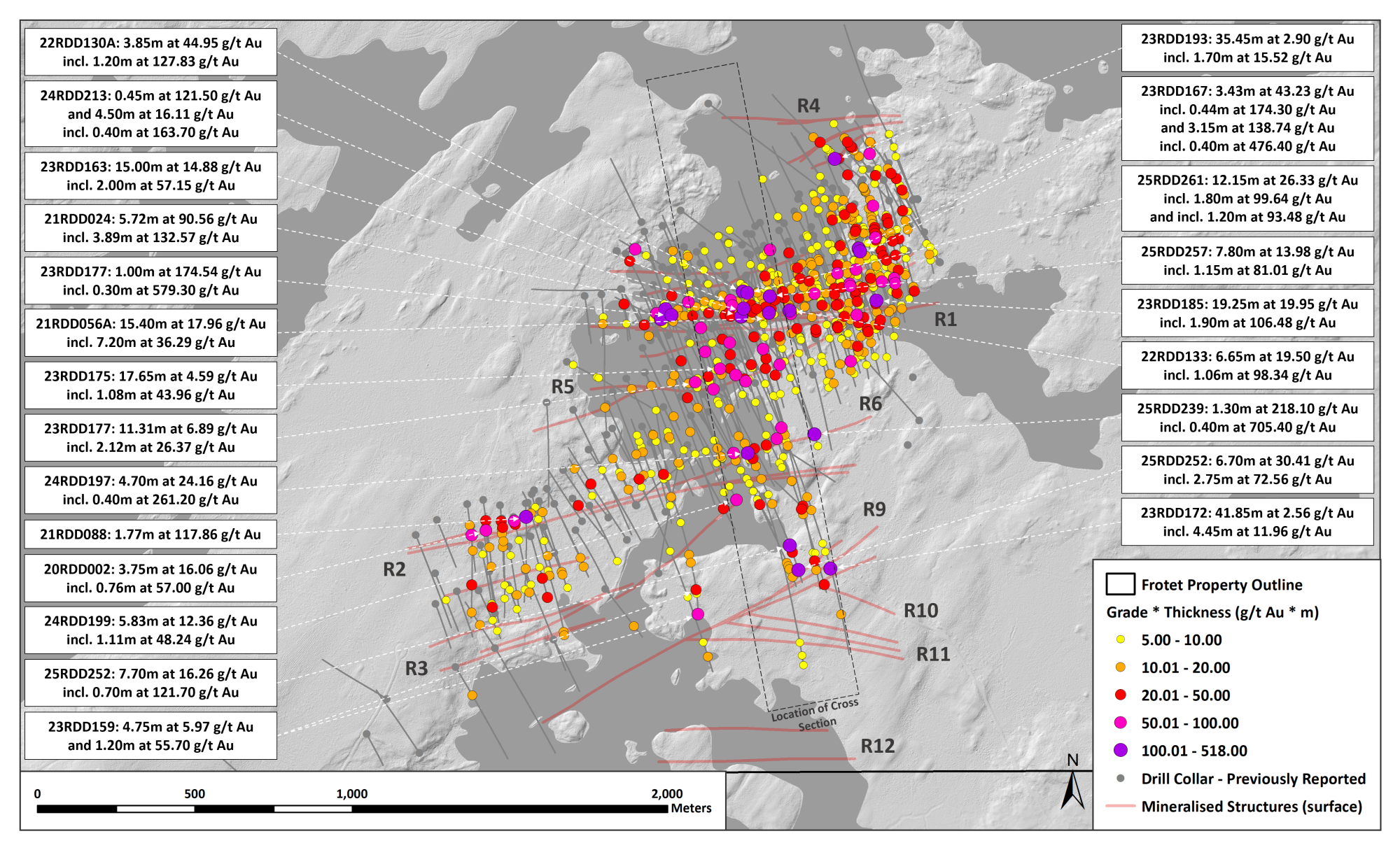 - 25RDD252: 6.70m at 30.41 g/t Au incl. 2.75m at 72.56 g/t Au at R11